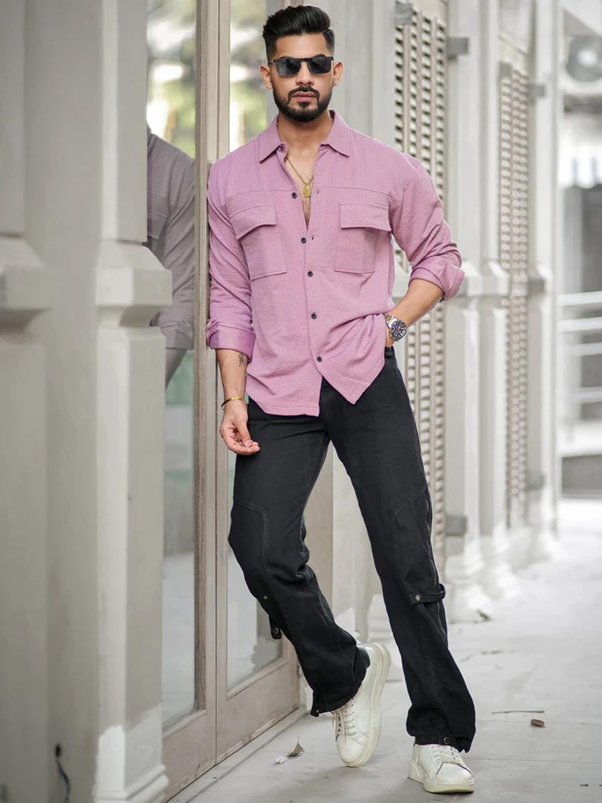 Step up your style game with the IndoPrimo Men’s Regular Fit Fancy Double Pocket Casual Shirt (Pink, L). Inspired by cargo-style design, this shirt offers a perfect mix of utility and fashion.