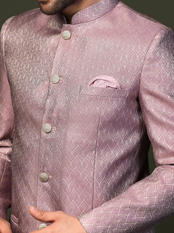 Make a regal style statement with the KISAH Men’s Jodhpuri Bandhgala Blazer (Lilac Jacquard, Size 44). Featuring a woven jacquard design, this blazer brings together classic Indian elegance and modern tailoring.
