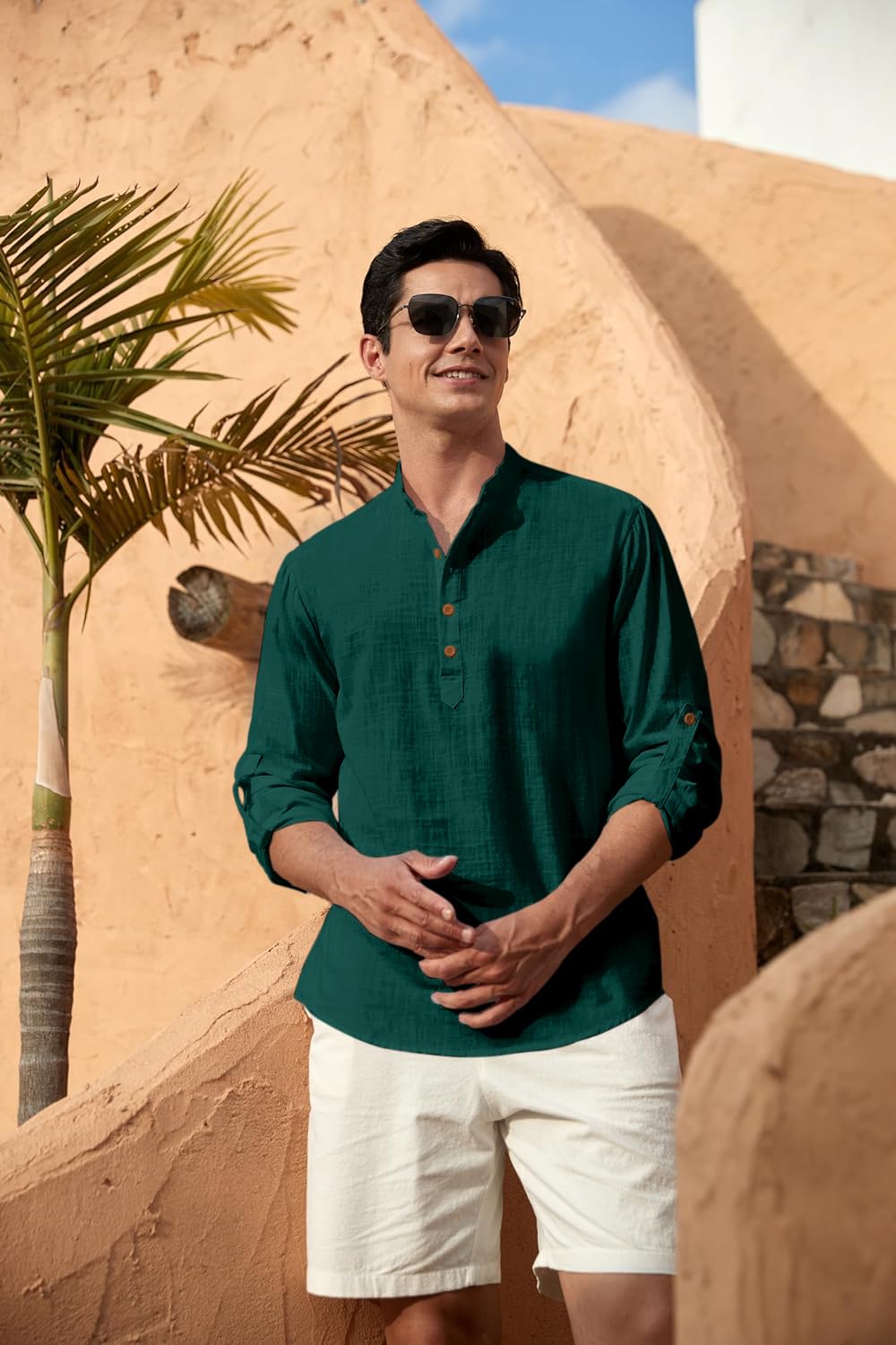 Zombom Men’s Solid Cotton Blend Straight Kurta Shirt, Regular Fit Full Sleeve Short Kurta Shirt Green